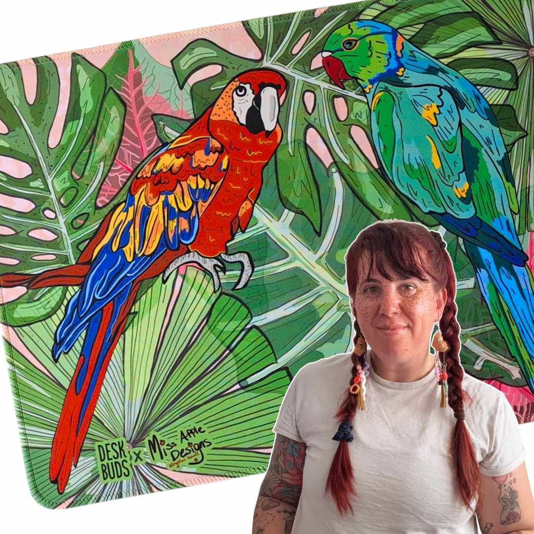 Hi, my name is Krystal Knafl and I am the designer/ owner of Miss Apple Designs. I am a Secondary Creative Arts Teacher by trade, living in sunny North Queensland and create cool art on the side. Although I dabble in many mediums, my first love is digital design. My designs tend to delve into the world of colour and fun delving into the themes of Australian Florals, Birds and Quirky Animals. I have been a part of many awesome collaborations over the years, including Biocup, Aether Brewery, Townsville City Libraries, Z and Tee and Rags to Raches. I am excited to be a part of this amazing collaboration with Ellen at Desk Buds as I get to be a part of something that my teacher and admin friends especially will enjoy.